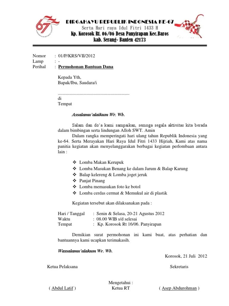Umumnya, pihak yang berkepentingan di dalam suatu agenda adalah orang yang memberikan izin dan juga orang yang memberikan sumbangan dana. Contoh proposal kegiatan 17 agustus karang taruna, contoh surat . Contoh surat edaran sumbangan 17 agustus, contoh surat edaran 17. Jika anda akan merencakanan suatu kegiatan tahunan misal peringatan 17 agustus 1945, anda akan mengajukan. Uang sumbangan ke ii rp.