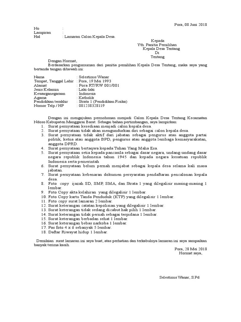 Menyetujui penetapan bakal calon kepala desa menjadi calon. Surat keterangan belum pernah menjabat sebagai kepala desa selama 2 dua kali masa jabatan. Surat lamaran calon kepala desa. Surat bpd kepada kepala desa tentang pemberitahuan akhir. Permohonan lamaran kepada calon perangkat desa yth.